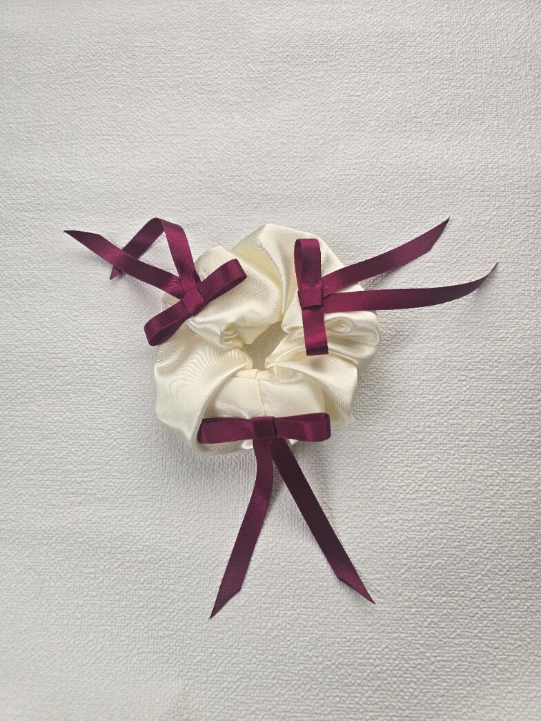 Elevate your everyday elegance with the Velvet Bloom scrunchie—a luxurious cream satin base adorned with four rich burgundy ribbon bows. Handcrafted for comfort and style, this piece blends softness with sophistication, making it perfect for festive looks, bridal styling, or upscale casual wear. Whether worn in a sleek ponytail or wrapped around a wrist, it adds a refined touch to any outfit.