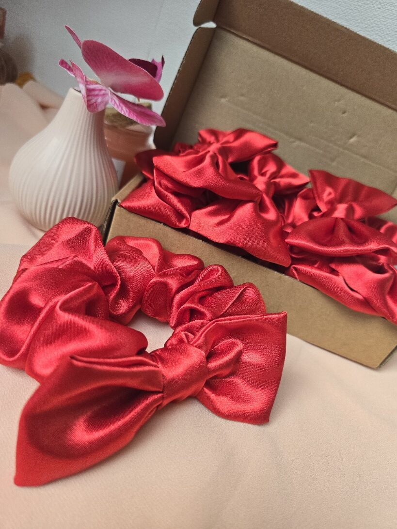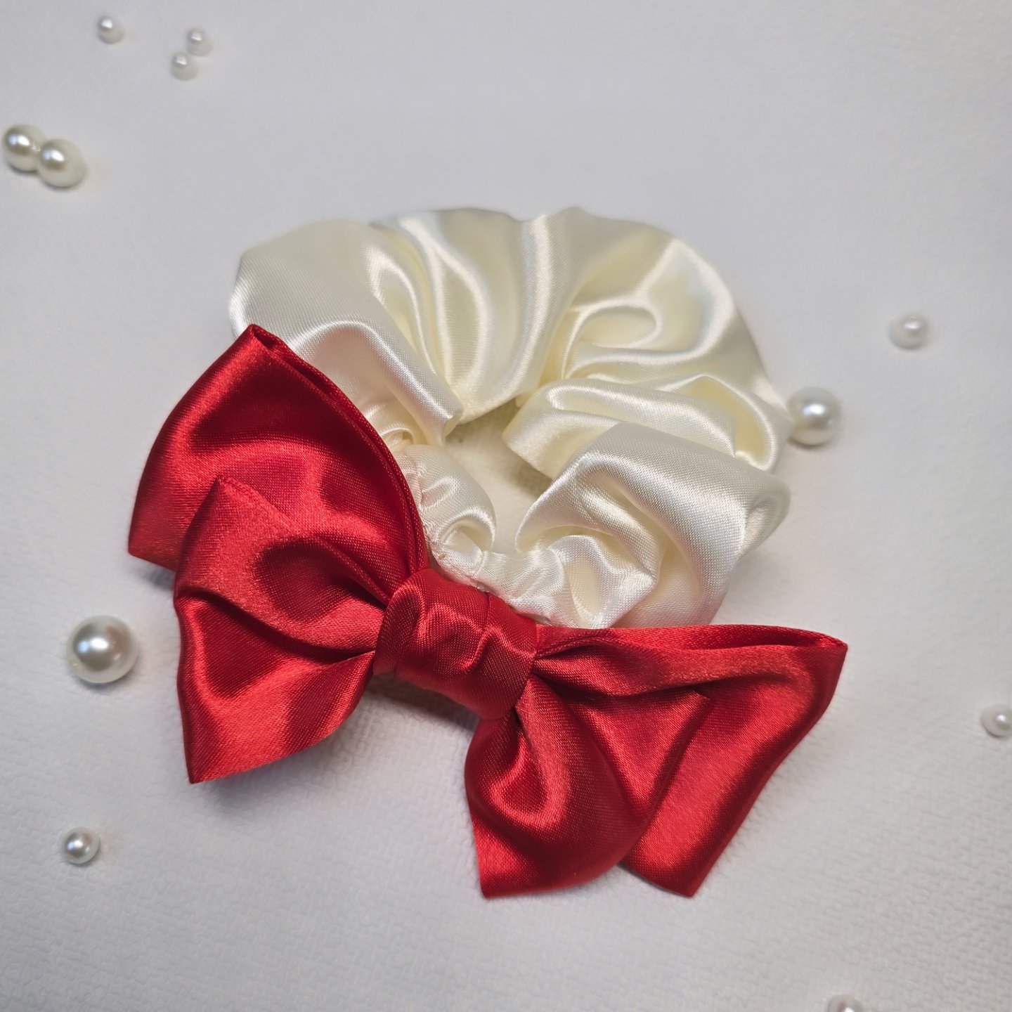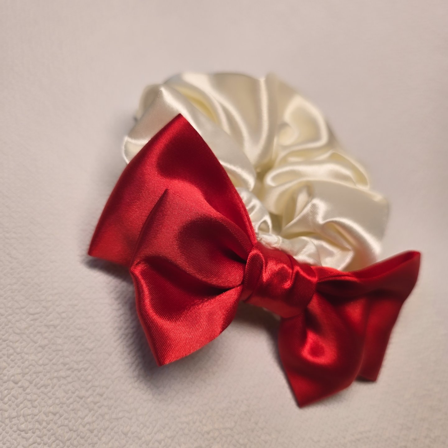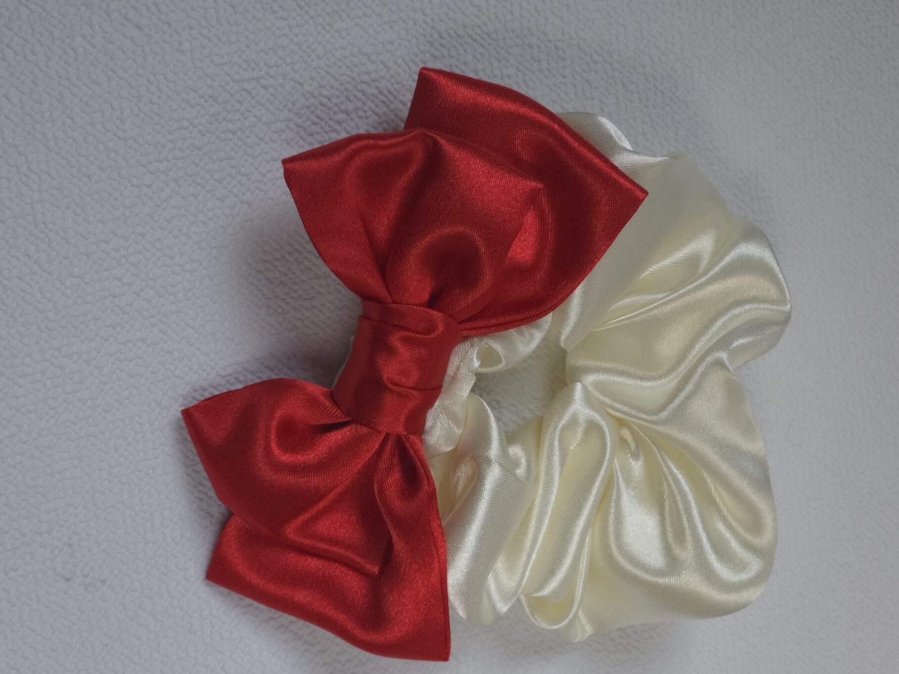 Add a touch of timeless elegance to your hairstyle with our premium satin bow scrunchies. Crafted from smooth, light-reflecting satin, each scrunchie features a delicate bow for a graceful finish. Perfect for everyday wear, festive looks, or gifting, these accessories combine comfort with couture. Available in rich red and classic white to complement any outfit. Handmade with love for hair that deserves luxury