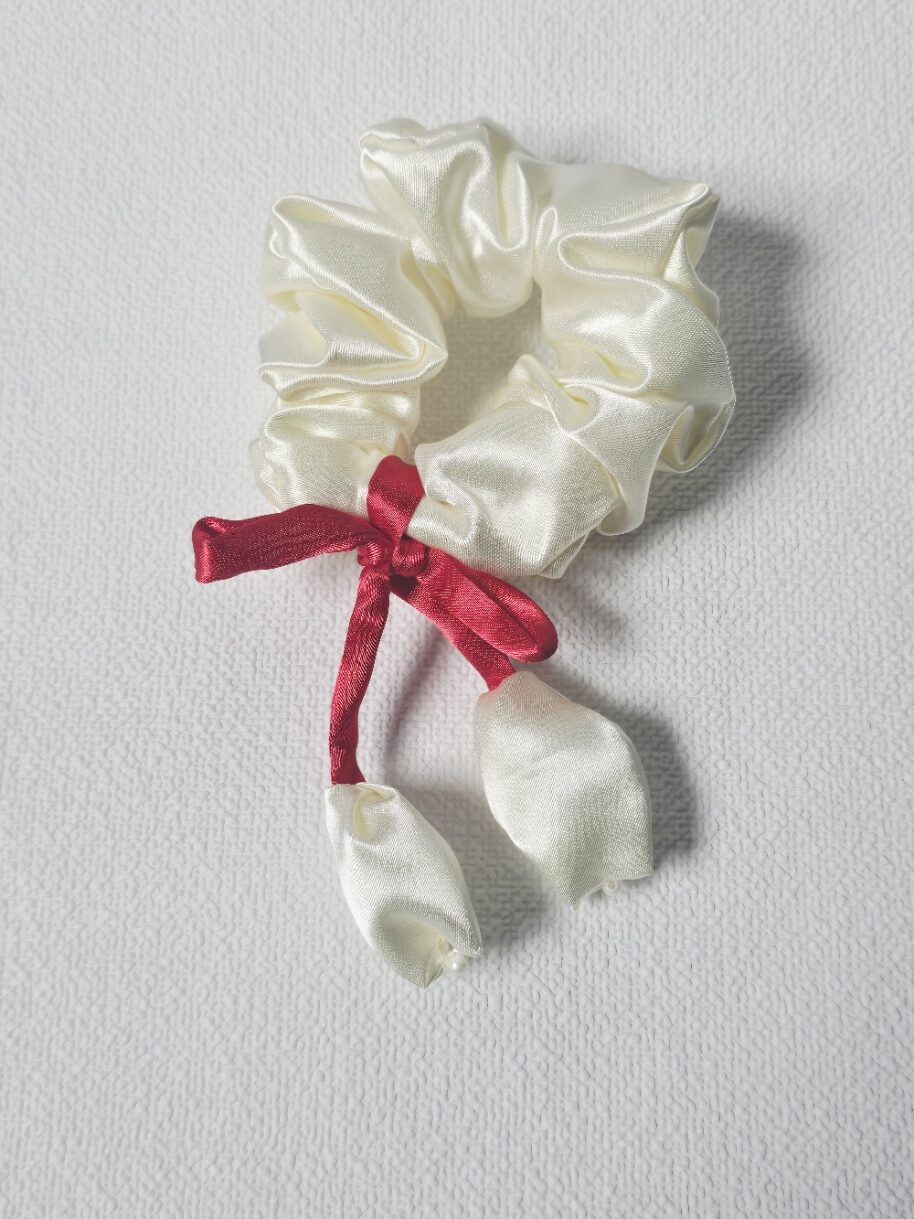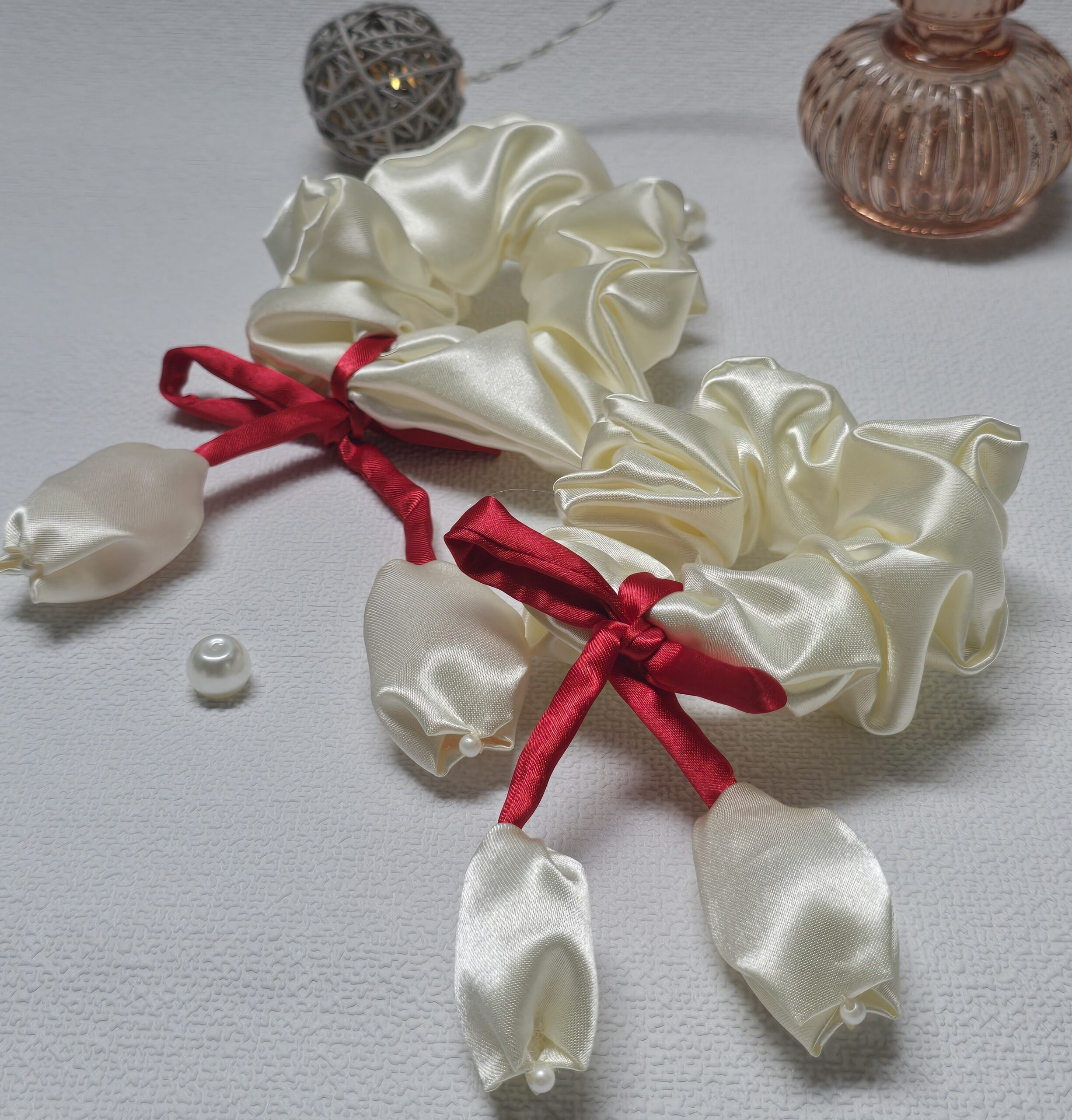 erfect for festive occasions, bridal styling, or adding a unique touch to your everyday look, these scrunchies combine softness, elegance, and a hint of whimsy. • Material: Premium ivory satin with red satin ribbon accents • Design: Tulip-shaped floral tails with pearl bead detailing • Hold: Gentle elastic for secure yet comfortable wear • Styling: […]